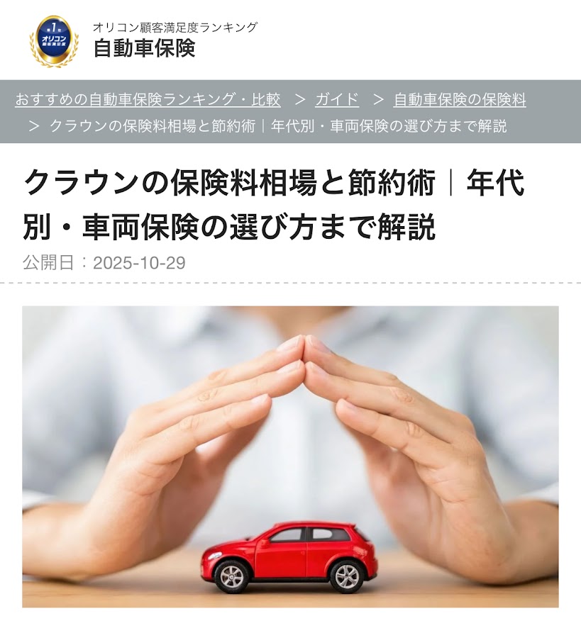 執筆記事掲載のお知らせ(オリコン満足度ランキング【クラウンの保険料相場と節約術|年代別・車両保険の選び方まで解説】