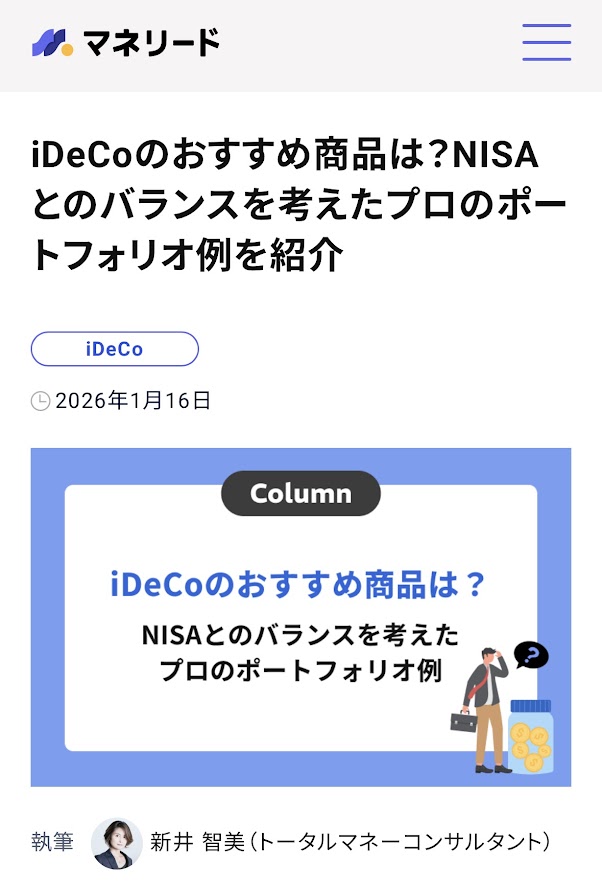 執筆記事掲載のお知らせ(マネリード【iDeCoのおすすめ商品は?NISAとのバランスを考えたプロのポートフォリオ例を紹介】)