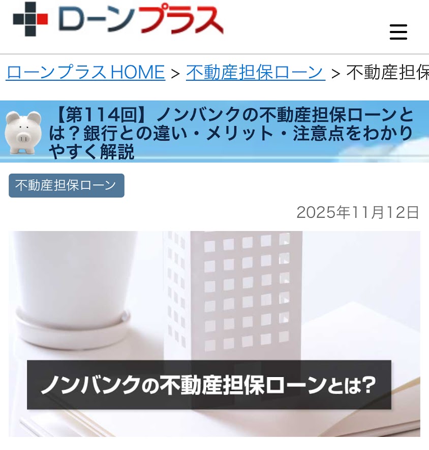 執筆記事掲載のお知らせ(ローンプラス【ノンバンクの不動産担保ローンとは?銀行との違い・メリット・注意点をわかりやすく解説】)
