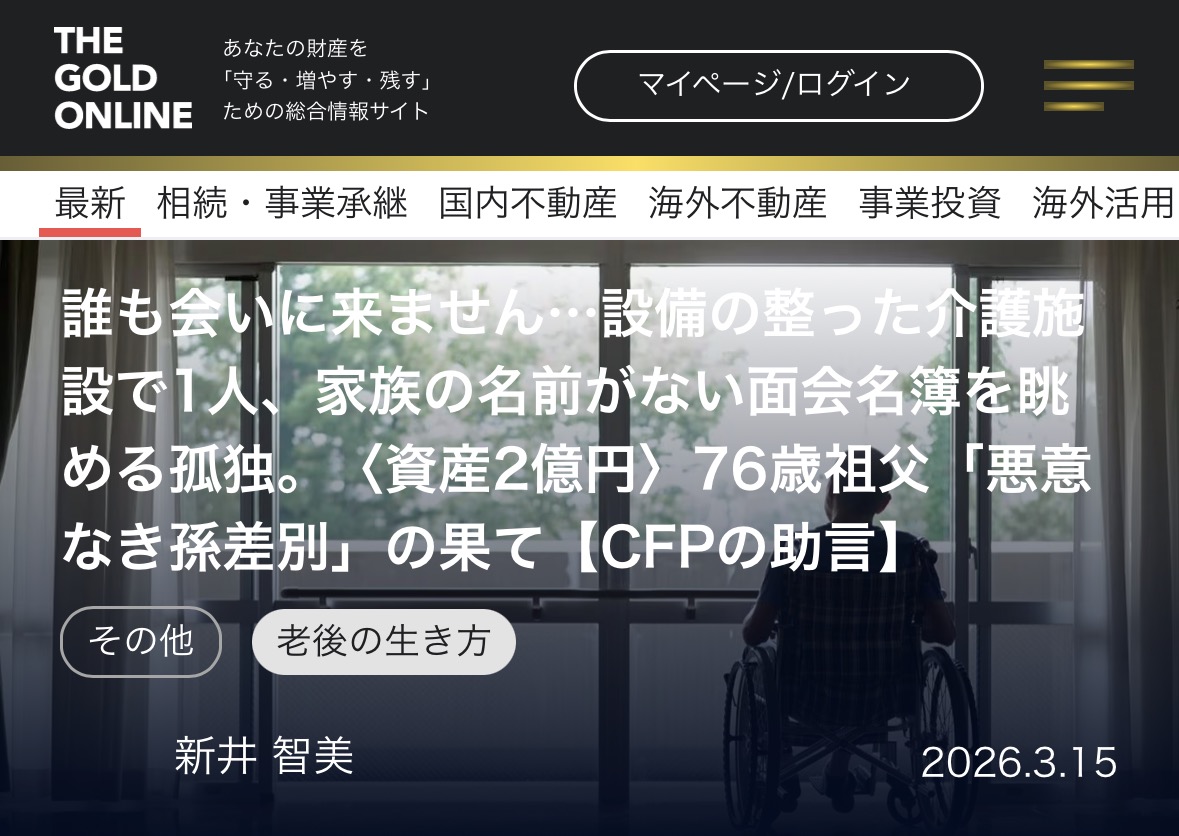 執筆記事掲載のお知らせ(幻冬舎オンライン【誰も会いに来ません…設備の整った介護施設で1人、家族の名前がない面会名簿を眺める孤独。〈資産2億円〉76歳祖父「悪意なき孫差別」の果て】)