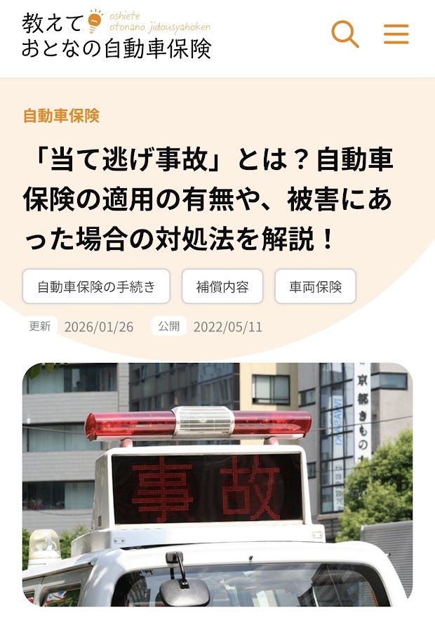 監修記事掲載のお知らせ(おとなの自動車保険【「当て逃げ事故」とは?自動車保険の適用の有無や、被害にあった場合の対処法を解説!】)