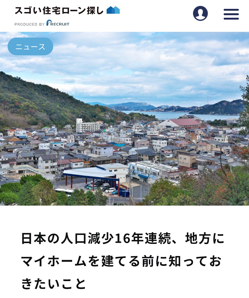監修記事掲載のお知らせ(スゴい住宅ローン探しサイト【日本の人口減少16年連続、地方にマイホームを建てる前に知っておきたいこと】)