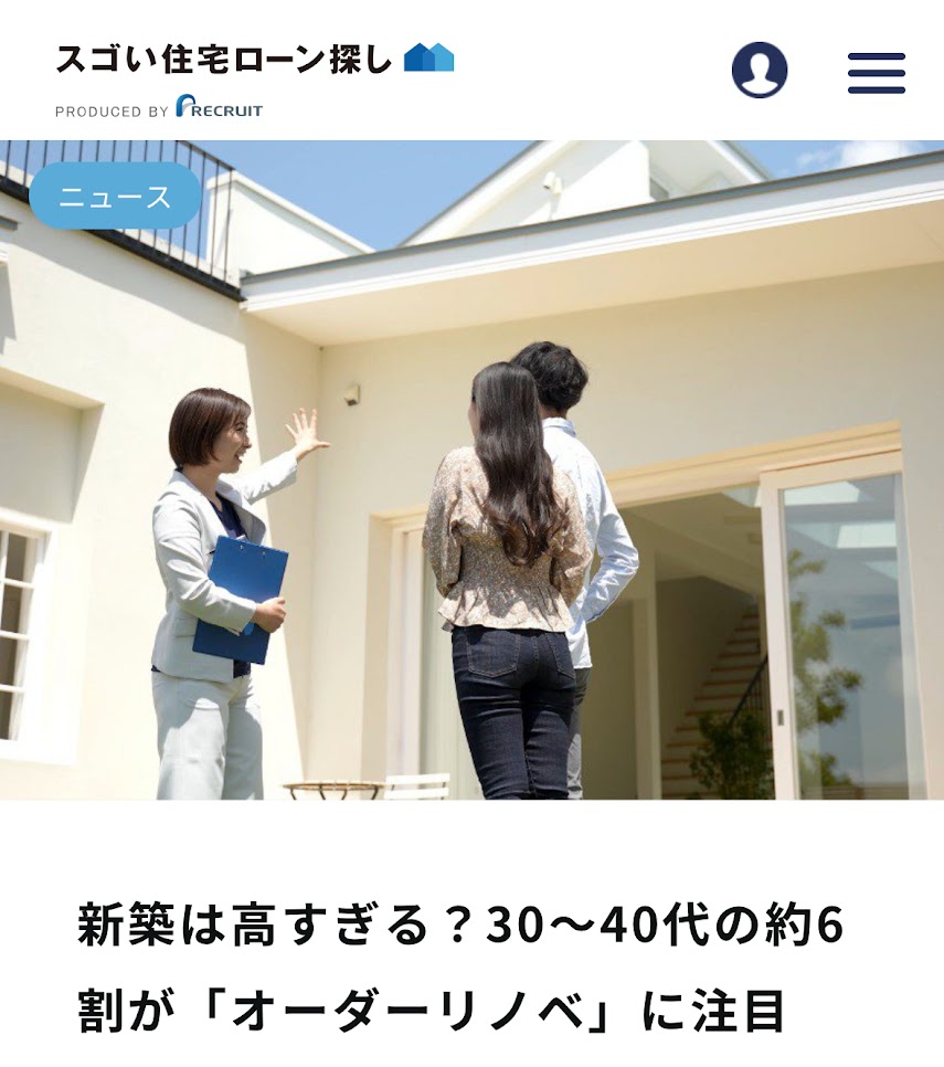 監修記事掲載のお知らせ(スゴい住宅ローン探しサイト【新築は高すぎる?30〜40代の約6割が「オーダーリノベ」に注目】)