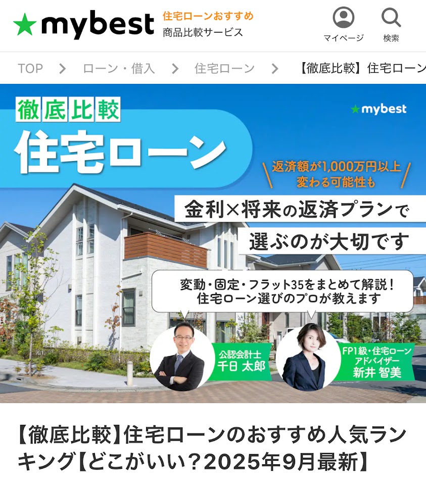 監修記事掲載のお知らせ(マイベストサイト【【徹底比較】住宅ローンのおすすめ人気ランキング【どこがいい?2025年9月最新】】)