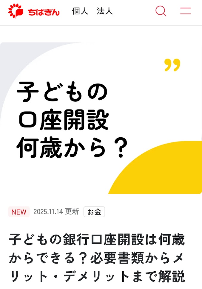 監修記事掲載のお知らせ(千葉銀行【子どもの銀行口座開設は何歳からできる?必要書類からメリット・デメリットまで解説】)