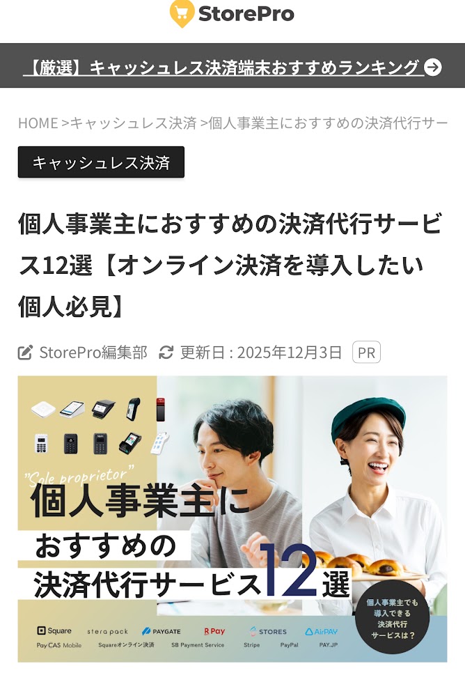 監修記事掲載のお知らせ(StorePro【個人事業主におすすめの決済代行サービス12選【オンライン決済を導入したい個人必見】)